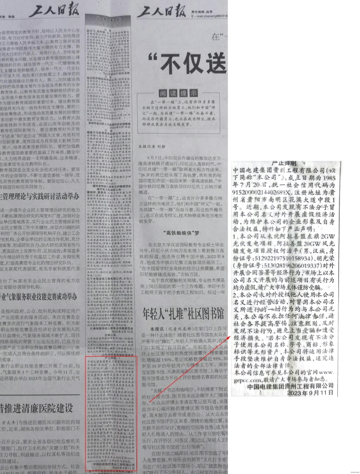 中國電建集團貴州工程有限公司(以下簡稱“本公司”),成立日期為1985年7月20日,統一社會信用代碼為91520000214402689X,注冊地址為貴州省貴陽市南明區花溪大道中段1號。 近期,本公司發現有不法分子冒用本公司名義對外開展虛假經濟活動,為維護本公司的企業形象及自身合法權益,特作如下嚴正聲明: 1、本公司從未就阿拉善盟左旗2GW光伏發電項目、阿拉善盟20GW風光儲發電項目授權何治平(男,漢族,身份證號:512922197510158934)、胡光榮(身份證號:513028196206019337)對外開展合同簽署等經濟行為,市場上以本公司名義開展的與前述項目有關行為均為虛假,請廣大市場主體謹防受騙。 2、本公司未對外授權他人使用本公司名義進行經營活動,對冒用本公司名義所進行的一切行為均與本公司無關,本公司不承擔任何法律責任,請社會各界提高警惕,注意甄別,及時發現不法行為,避免上當受騙和遭受經濟損失。若本公司發現有不法分子使用本公司名稱、字號、商標、形象標識等無形資產,本公司將運用法律手段堅決維護自身合法權益,追究違法者的全部法律責任。 本公司信息可參見本公司的官網www.ytkangchen.com,敬請廣大市場參與者知悉。 中國電建集團貴州工程有限公司 二0二三年九月十一日 |